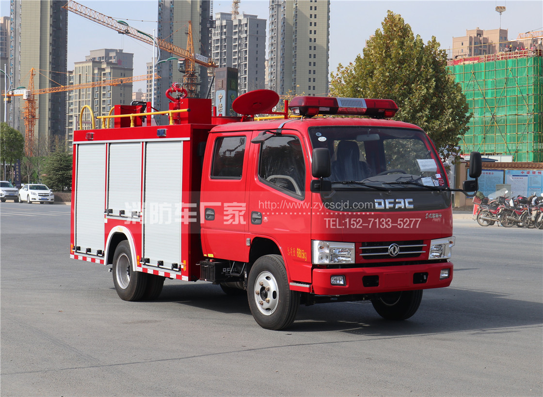 东风2.5吨水罐消防车,采用东风福瑞卡底盘,双排驾驶室,底盘型号EQ1070,全柴115马力发动机,标配67.50-16钢丝胎,轴距3300mm.